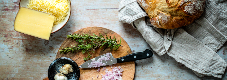 ländle Weinkäse reiben. Schalotten und Kräuter fein schneiden, Knoblauch pressen.